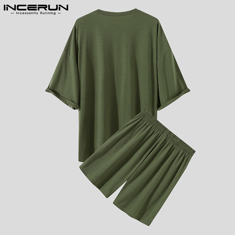 INCERUN Mens Shorty Pajamas Sets Nightwear Japanese Loose Fit Tops Shorts Sleepwear Suit (Korean Style)