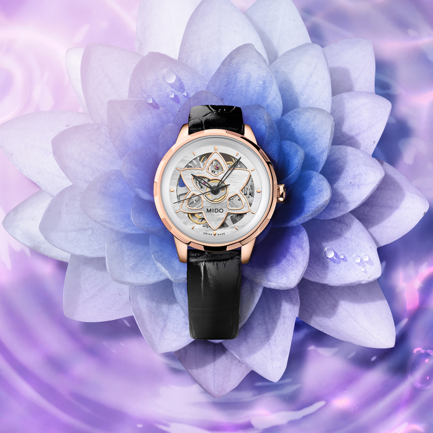 For the first time, Mido has created a skeleton Swiss watch especially dedicated to women. The new and audacious Rainflower Blossom features delicate lines, directly inspired by the lotus flower shape of Singapore’s contemporary ArtScience Museum. Resolutely feminine petals are interlaced along the edges. Adorned with an openwork flower, the captivating dial reveals at its centre the Caliber 80 – the latest-generation automatic movement, whose mainplate has been specially skeletonised and decorated. It invites the wearer to marvel at the passing of time with audacityand elegance.