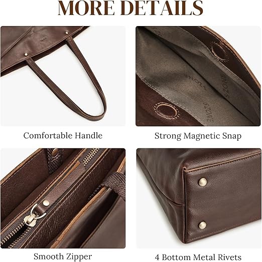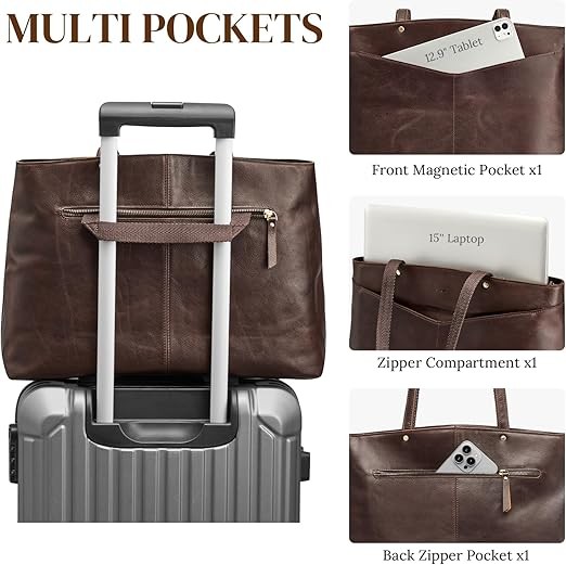 - Organized Storage: This leather work tote bag features 1 main zipper compartment with a laptop compartment that fits up to 15 inches, 1 inner zipper pocket, 2 inner slip pockets and pen slots, keeping your essentials well organized